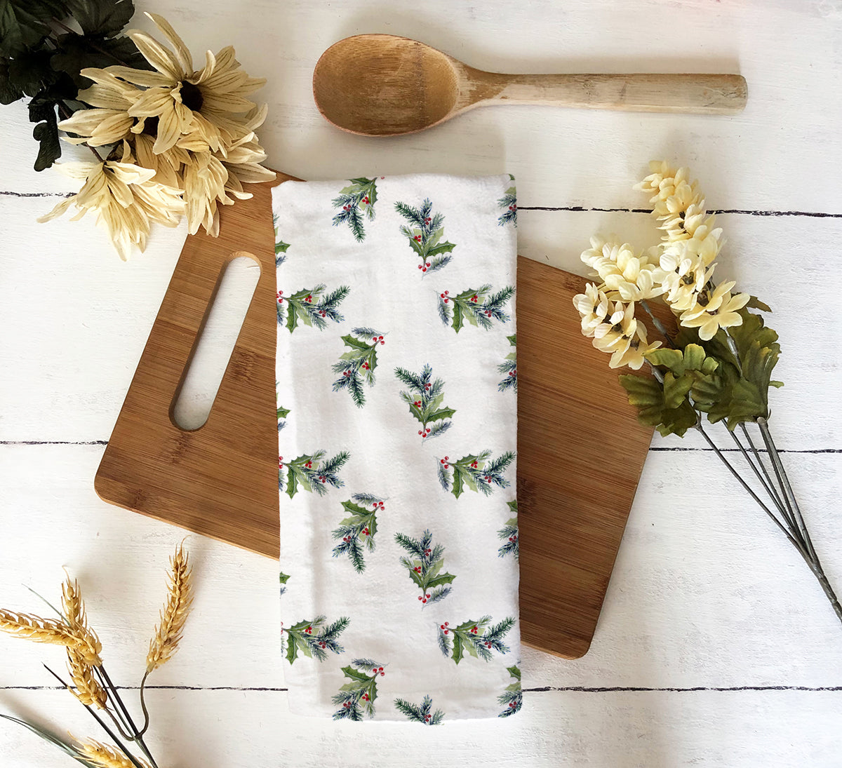 This Hand Towel features a beautiful design of watercolor holly branches by Patti Bishop, creating a festive and cozy atmosphere perfect for the holiday season. It is soft to touch, vibrant in colors, and absorbent, making it a practical and decorative addition to your kitchen or bathroom. Ideal for those who love to decorate their home for Christmas and other winter celebrations.